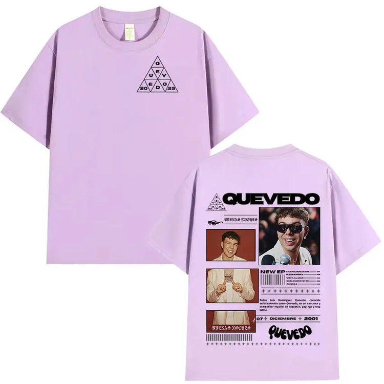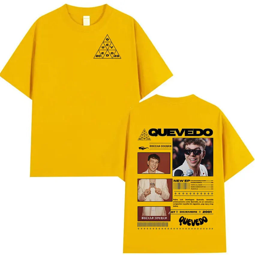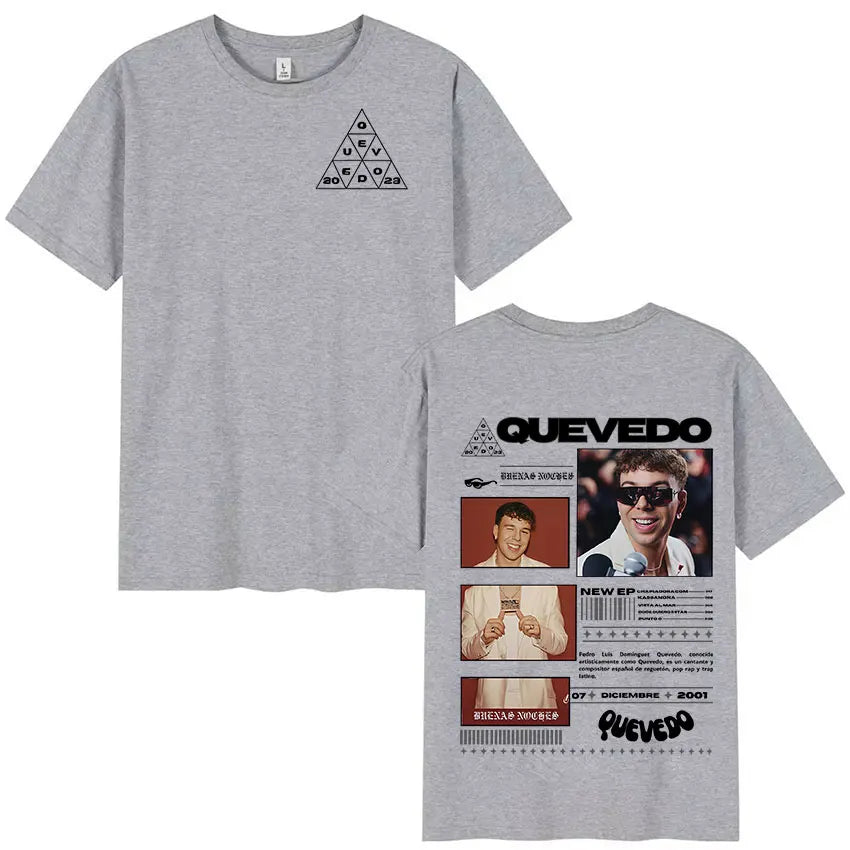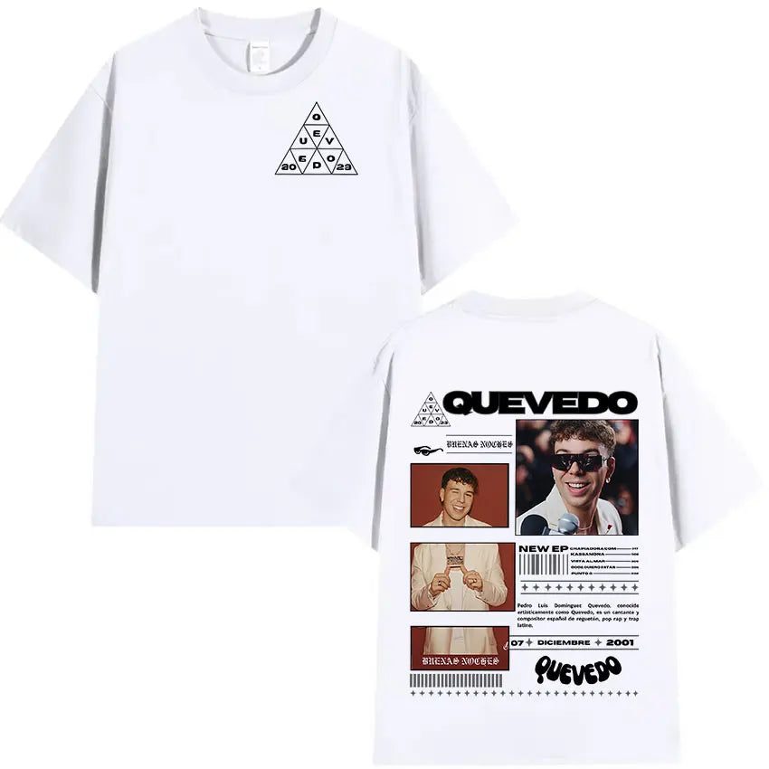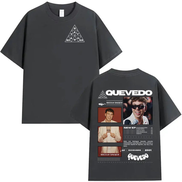 Estética Urbana con Alma: Cada prenda refleja el mood melancólico y callejero de Quevedo —gráficos con vibes nocturnas, frases que conectan con lo real y diseños que respiran barrio—. Esta colección no es solo ropa, es un manifiesto de lo que sientes pero no siempre dices.