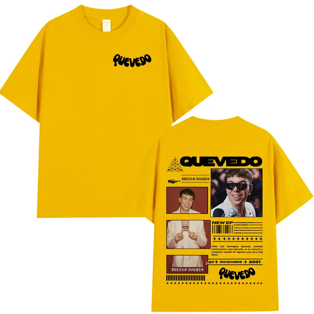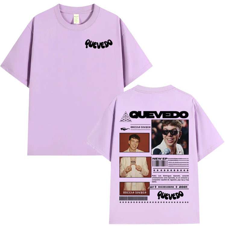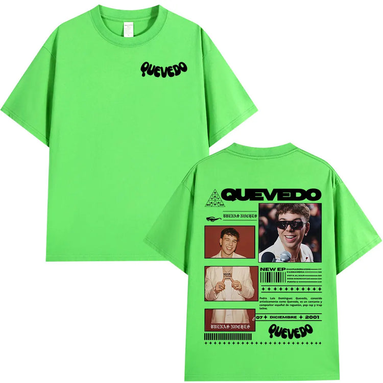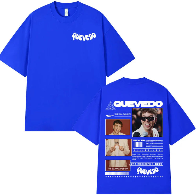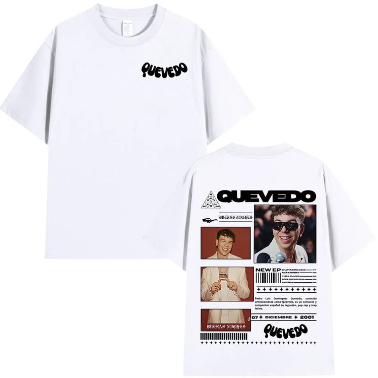 Estética Urbana con Alma: Cada prenda refleja el mood melancólico y callejero de Quevedo —gráficos con vibes nocturnas, frases que conectan con lo real y diseños que respiran barrio—. Esta colección no es solo ropa, es un manifiesto de lo que sientes pero no siempre dices.